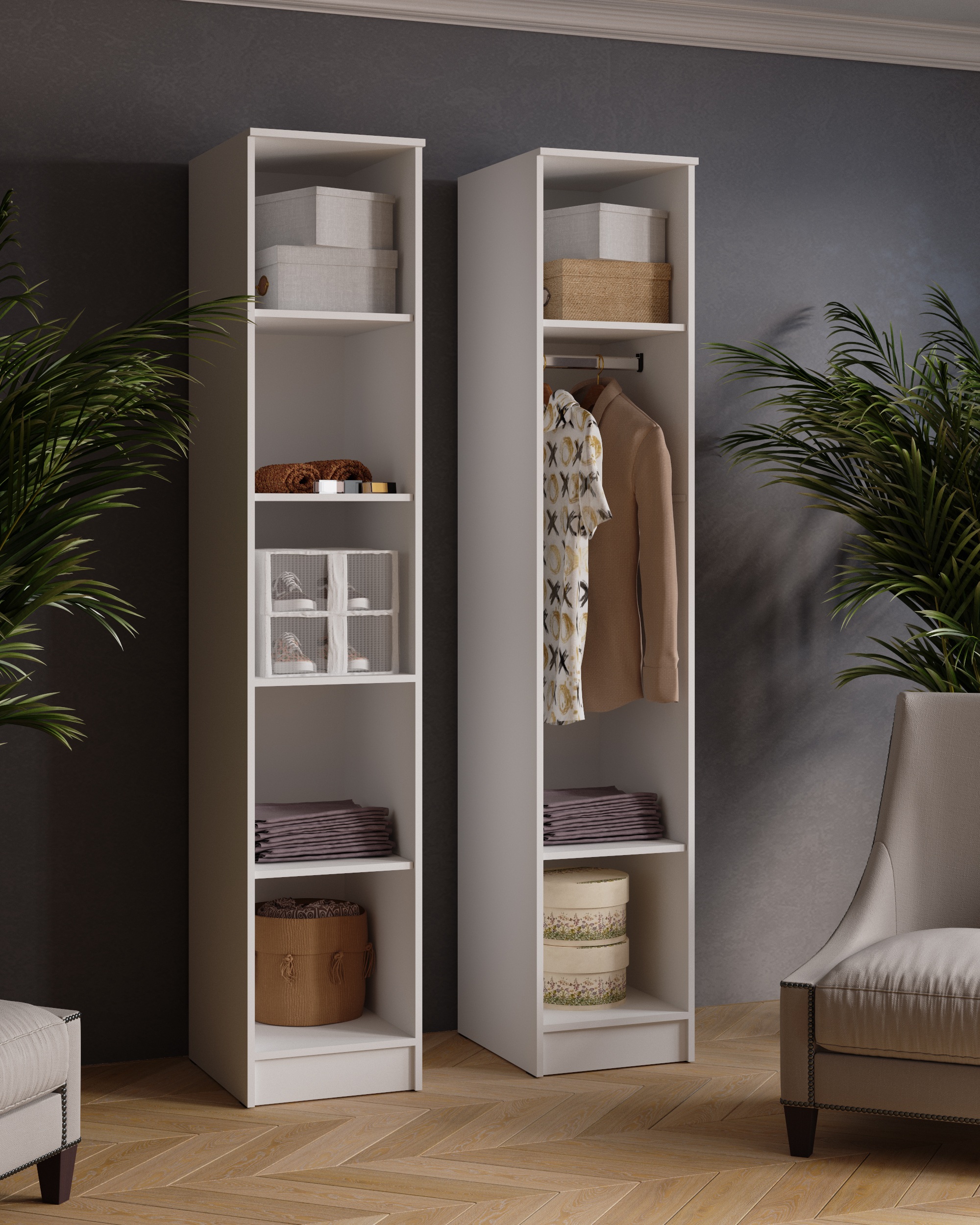 Пенал Ларс имеет два варианта внутреннего исполнения: это либо пять полок, либо комбинированный вариант - две полки и стационарная металлическая штанга для плечиков.
